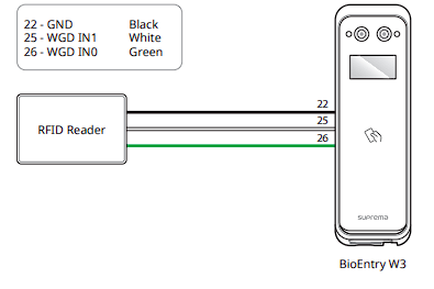 Pins 23 & 24 offer Wiegand input, Pins 25 & 26 allow Wiegand output both can be used at the same time