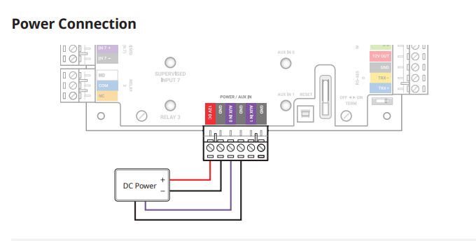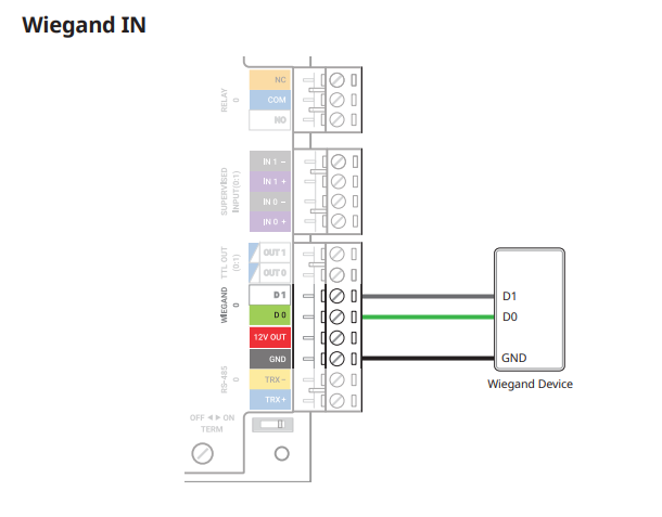 The power output (12V, up to 1.5A) of CS-40 can be used as the power for a Wiegand device when CS-40 and the Wiegand device are connected. In other words, when 3 Wiegand devices that consume 200mA are connected, a device that consumes up to 900mA can be connected to the remaining power output terminal.