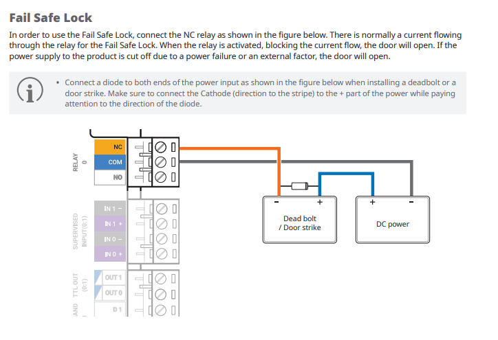Connect a diode to both ends of the power input as shown in the figure below when installing a deadbolt or a door strike. Make sure to connect the Cathode (direction to the stripe) to the + part of the power while paying attention to the direction of the diode.