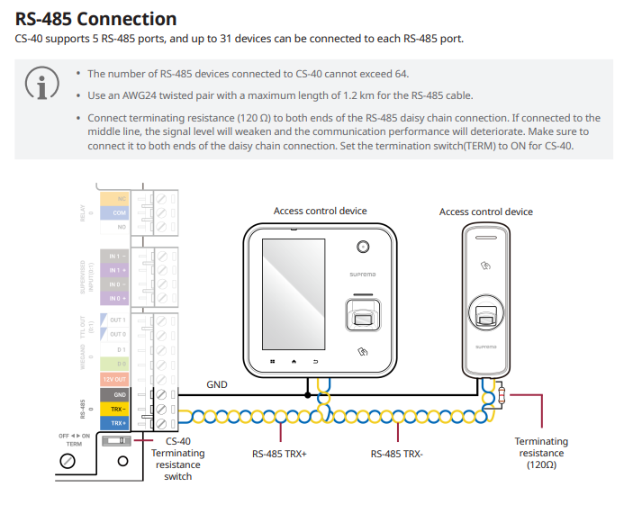 The number of RS-485 devices connected to CS-40 cannot exceed 64. Use an AWG24 twisted pair (Belden 9841) with a maximum length of 1.2 km for the RS-485 cable. Connect terminating resistance (120 Ω) to both ends of the RS-485 daisy chain connection. Make sure to connect it to both ends of the daisy chain connection. Set the termination switch(TERM) to ON for CS-40.